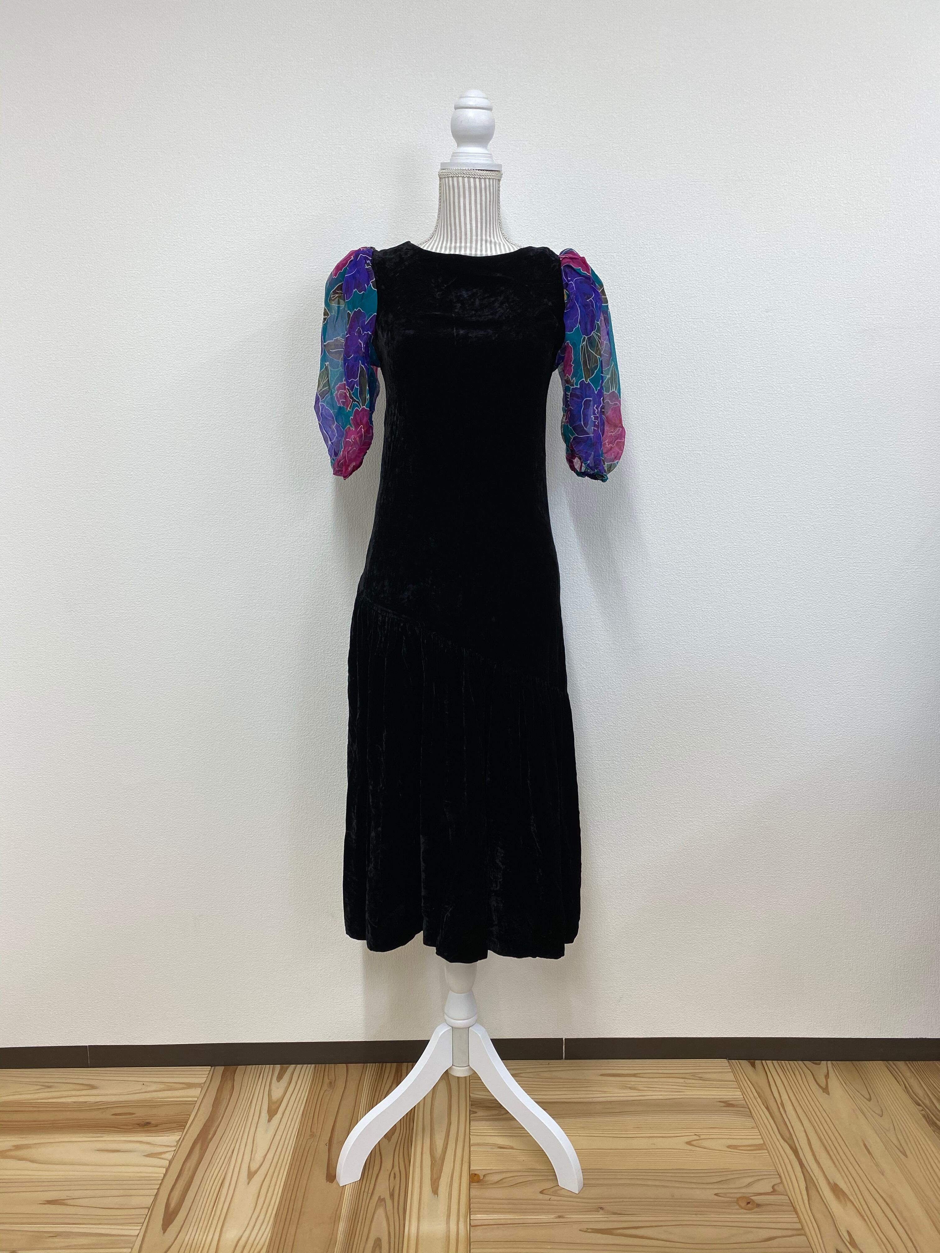 鮮やかなオーガンジーの花柄素材の袖が付いた、ベロアのワンピース。