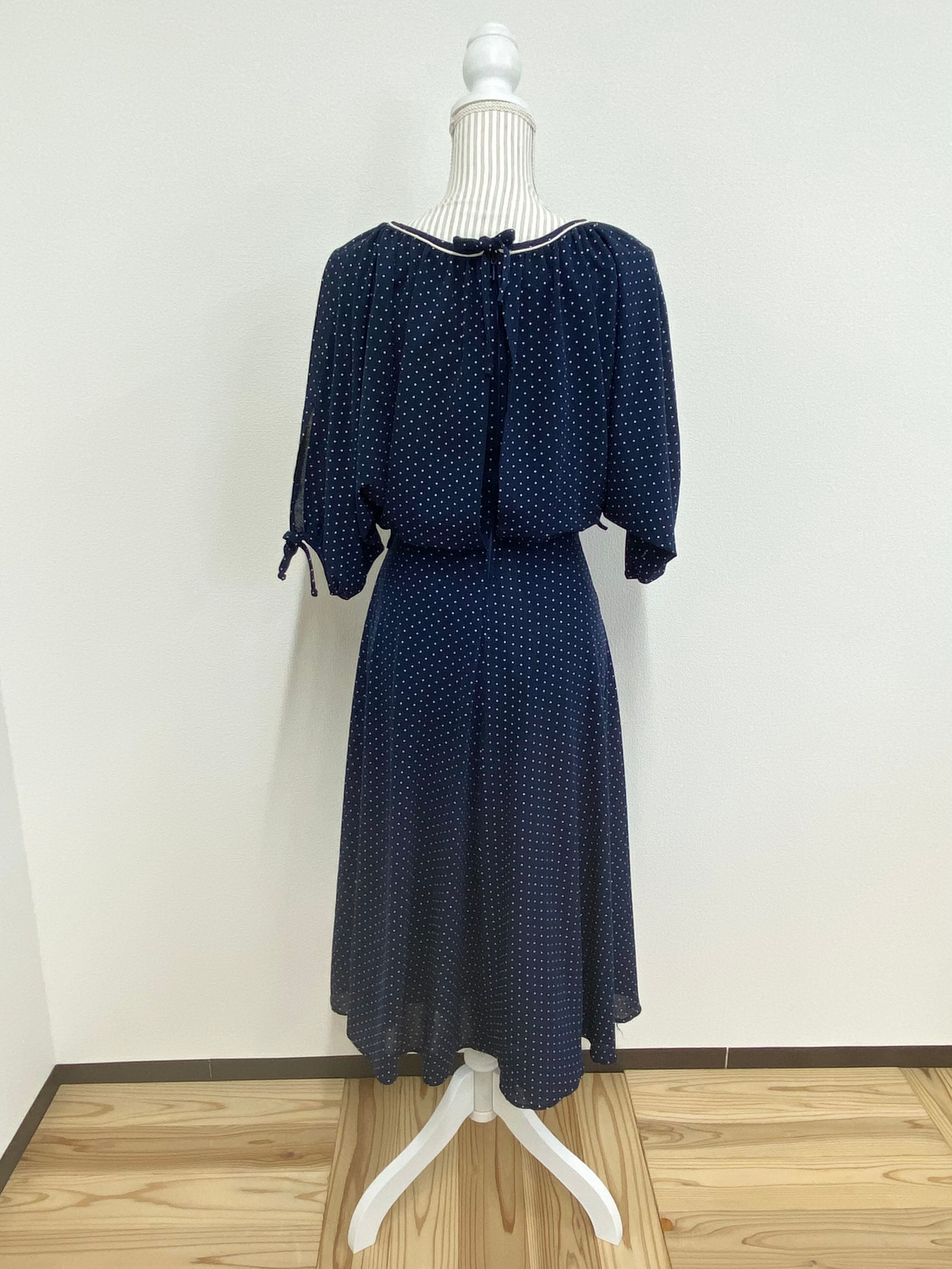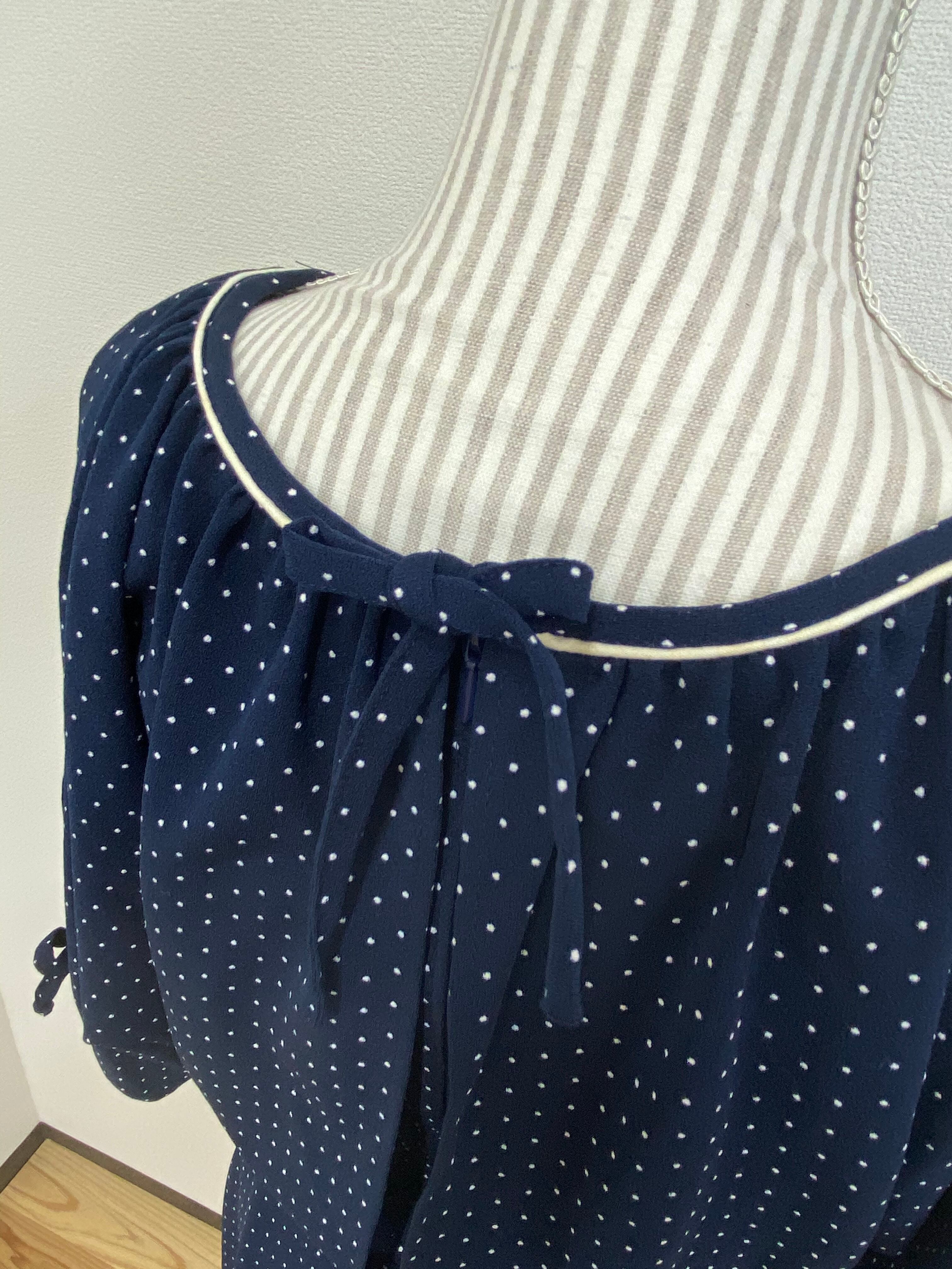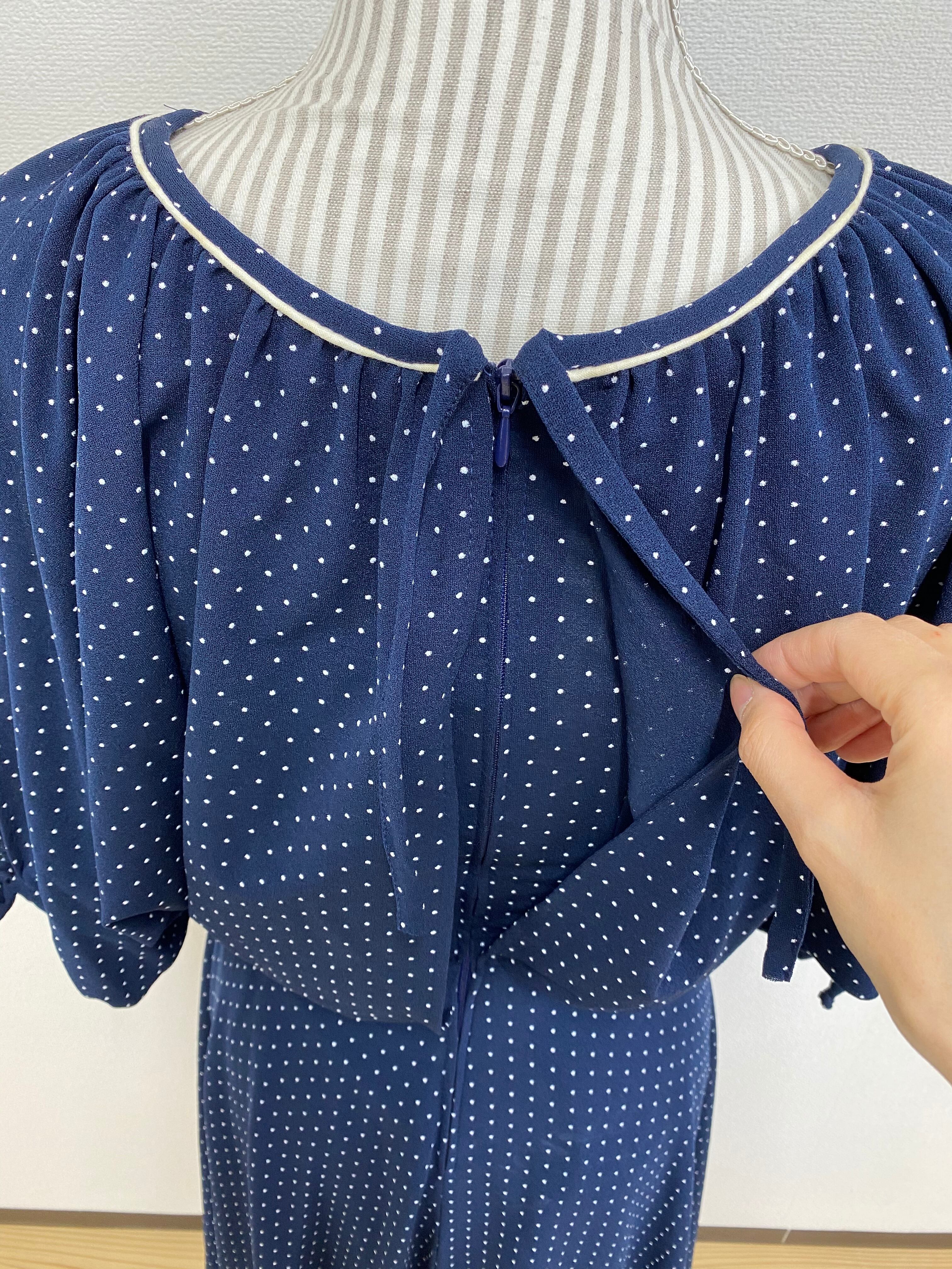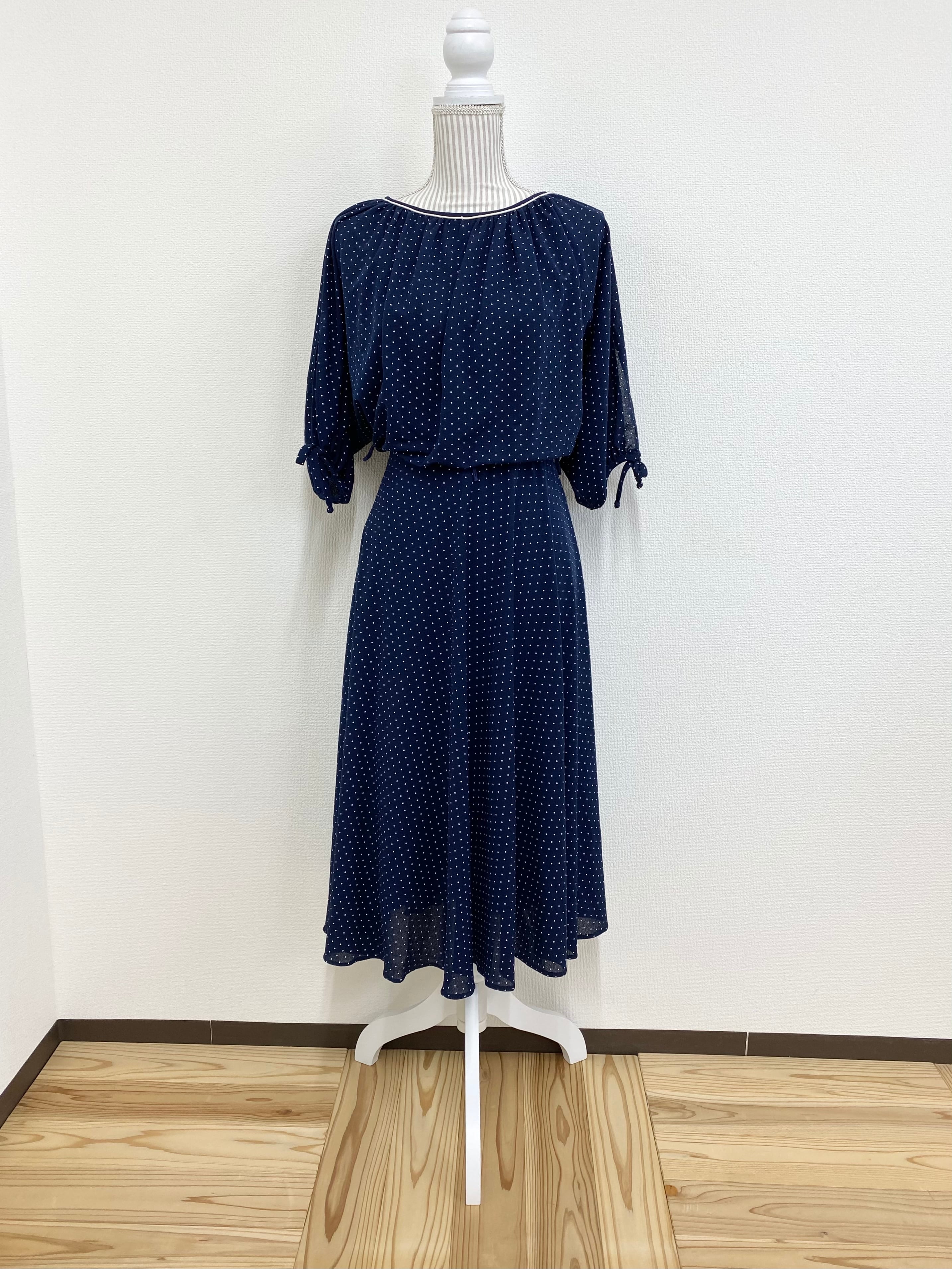 ジャージ素材で柔らかく着心地の良いワンピース。ドット柄が小さいので、大人が着やすいプリントです。